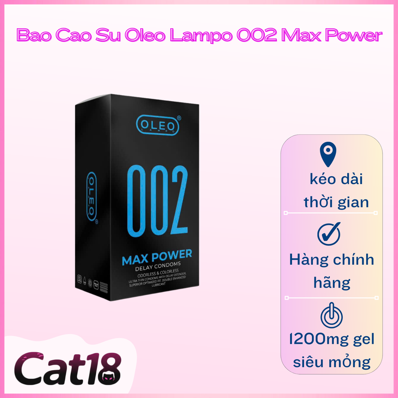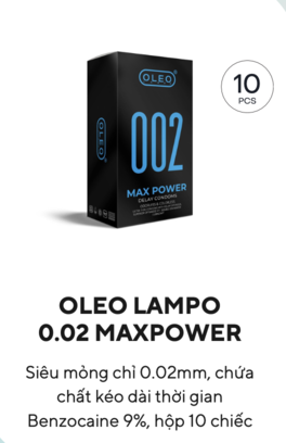 OLEO Lampo 0.02 MaxPower là dòng bao cao su cao cấp siêu mỏng chỉ 0.02mm, kết hợp Benzocaine 9% hỗ trợ kéo dài thời gian quan hệ. Sản phẩm mang lại cảm giác chân thật, ôm sát và an toàn, phù hợp cho nam giới gặp tình trạng xuất tinh sớm hoặc mong muốn cải thiện thời lượng “cuộc yêu”.
